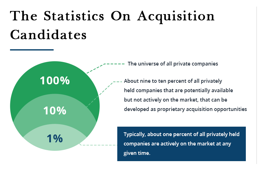 Typically, about one percent (1%) of all privately held companies are actively on the market at any given time. However, there are many more businesses, about nine to ten percent (9%-10%) of all privately held companies that are potentially available but not actively on the market, that can be developed as proprietary acquisition opportunities using a proactive buy-side search.